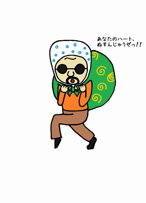 恋のどろぼうをするとき用のワシの服装。これまで盗めたハートはありません。袋には女子が好きなスイーツが入っています。