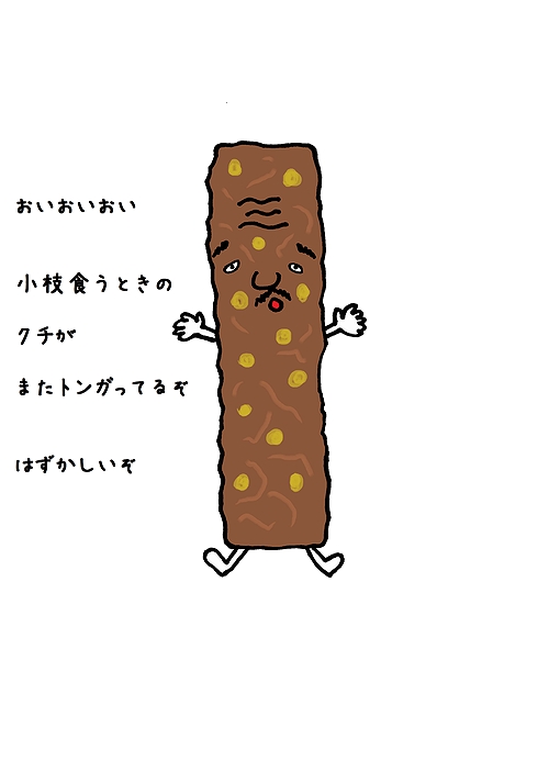 森永製菓の定番お菓子の小枝風キャラクター用のワシの服装。止まらないんじゃ、一本がちっちゃいから!